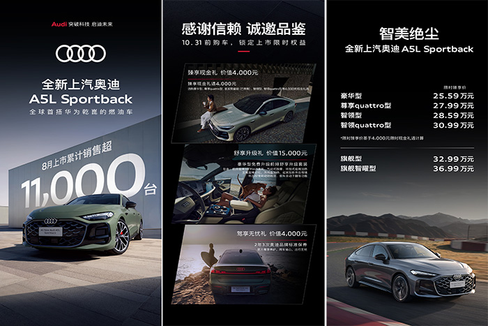 为回馈首批用户的青睐,A5L Sportback于上市首销期间特别推出多重购车礼遇。选购豪华型、尊享quattro型、智领型、智领quattro型的用户,均可享受4,000元现金优惠,直接降低购车门槛。选购豪华型的用户还可免费升级价值15,000元的前排舒享套装,其中包含前排座椅3D Mesh通风、气动按摩、环抱式座椅加热、主驾座椅记忆、方向盘加热、迎宾投影外后视镜、外后视镜自动防眩目及倒车自动下翻等多项高端配置,真正实现“入门即豪华”的越级体验。此外,所有购车用户均可获赠价值4,000元的“驾享无忧礼”,内含2年3次奥迪品牌官方养护服务,全方位保障用车品质与安心体验。A5L Sportback首销专属礼遇将于10月31日截止,即刻预定,锁定超值用车权益。