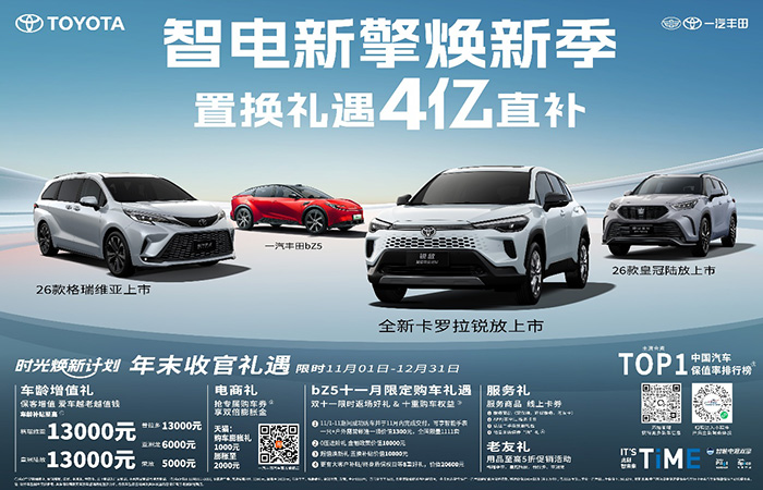 每年年底,历来是消费者的购车旺季,当然也是车企出新冲量的最佳时机,在金秋时节,一汽丰田即以“价值升维”,回应行业价格战迷局。在短短10天之内,就接连推出了2026款皇冠陆放、2026款格瑞维亚,以及全新卡罗拉锐放3款焕新升级车型,从10万元级家用通勤到30万元级豪华出行,覆盖了不同细分市场,全面满足了消费者的多元化需求。