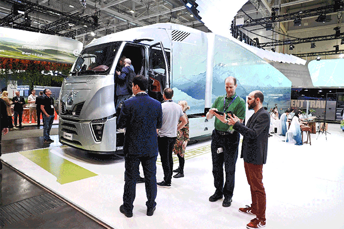 除了那个蜚声海外的黄河车,现场的明星产品还有很多。比方说斩获“年度智能网联牵引车”“高效创富先锋”等九项行业大奖的汕德卡C9H、豪沃TH7-N;再比方上市即热销的旗舰产品汕德卡G7H 720马力燃气牵引车……