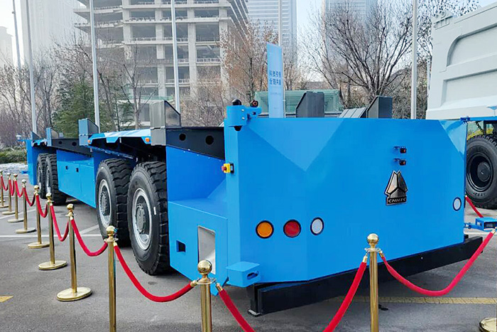 除了这些“国民重卡”,现场还涌现了一些新能源巨无霸。像CNHTC智能导引运输车,其不仅采用了纯电驱动,还拥有L4级无人驾驶和智慧管理功能,堪称港口自行走的“搬运工”。