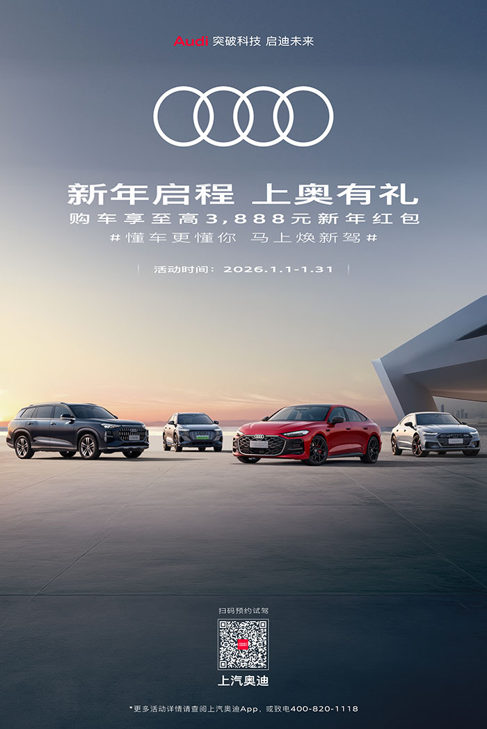 1月6日,上海,全新上汽奥迪A5L Sportback旗舰车型(200kW)已全面开启交付。值此新年到来之际,上汽集团正式启动“懂车更懂你,马上焕新驾——2026上汽新春欢乐购”。上汽奥迪同步推出新年购车礼遇:即日起至1月31日,购买全新上汽奥迪A5L Sportback、上汽奥迪A7L、上汽奥迪Q6或上汽奥迪Q5 e-tron任意车型,可享至高3,888元新年红包,助力用户轻松开启安心无忧的豪华出行新程。