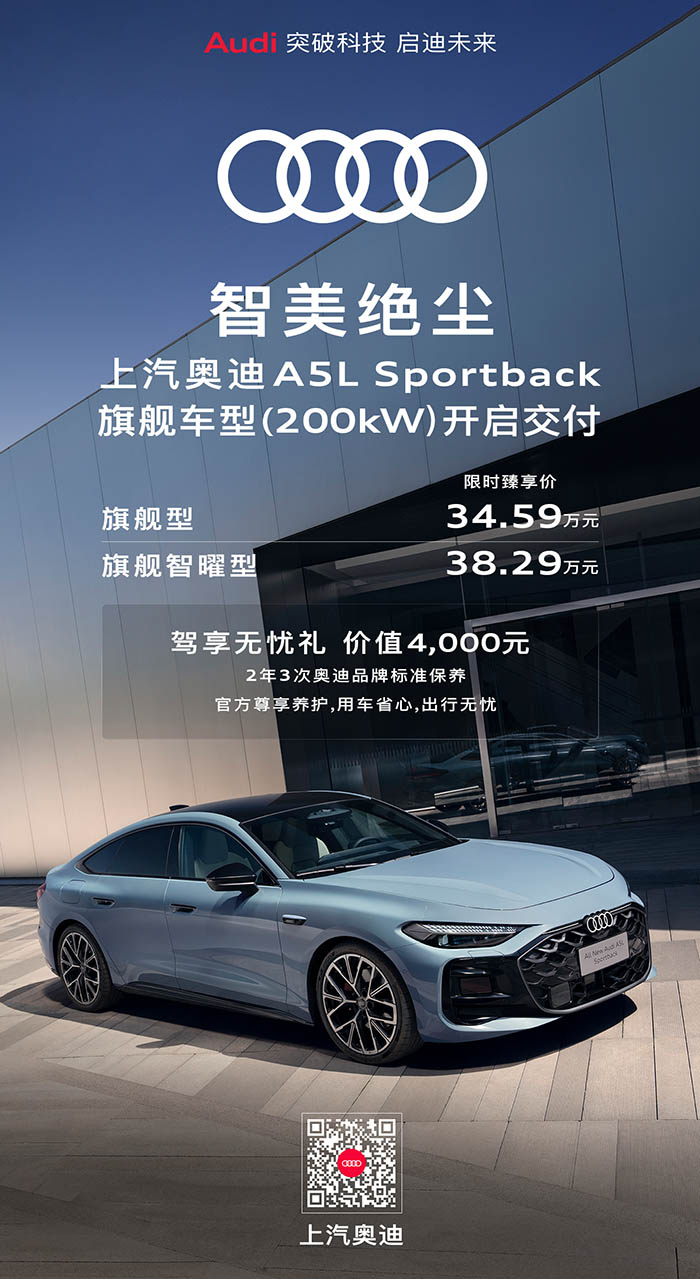 本次交付的上汽奥迪A5L Sportback旗舰车型共推出两款配置,其中“旗舰型”限时臻享价34.59万元,“旗舰智曜型”限时臻享价38.29万元。为回应用户期待,购车即可尊享价值4,000元的“驾享无忧礼”,包含2年3次奥迪品牌标准保养服务,以体系化专业养护保障用车全程品质。