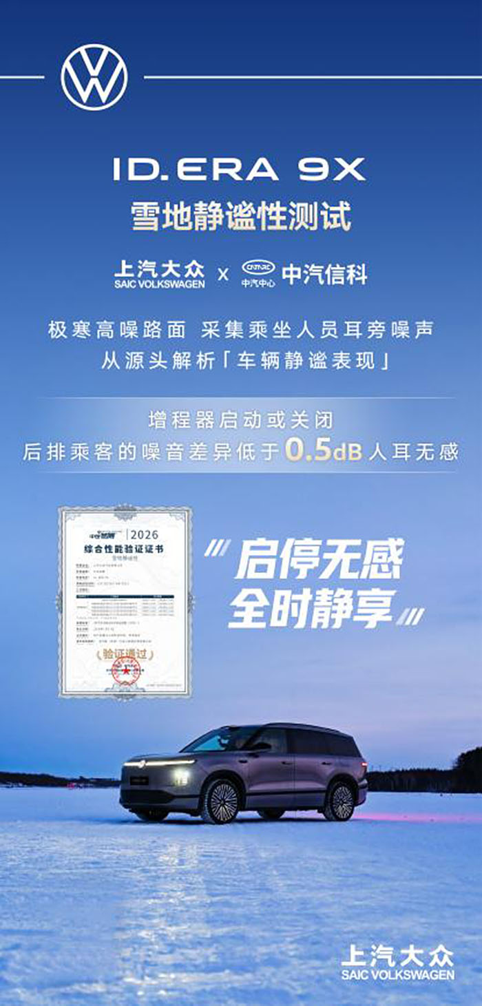 当增程技术遇上零下30℃的极限考场,真正的硬实力随之显现。为全面验证极端气候下的动力稳定性与系统可靠性,上汽大众近日将ID. ERA 9X带到黑河极寒测试场,围绕低温启动、动力输出与整车静谧性等关键指标,对这款“德系满级旗舰SUV”的综合实力进行验证。测试过程中,新车依托大众EA211增程器打造的“黄金增程系统”,在极寒工况下以稳定、扎实的实测表现,印证其作为增程车型3.0时代代表作的硬核底气。