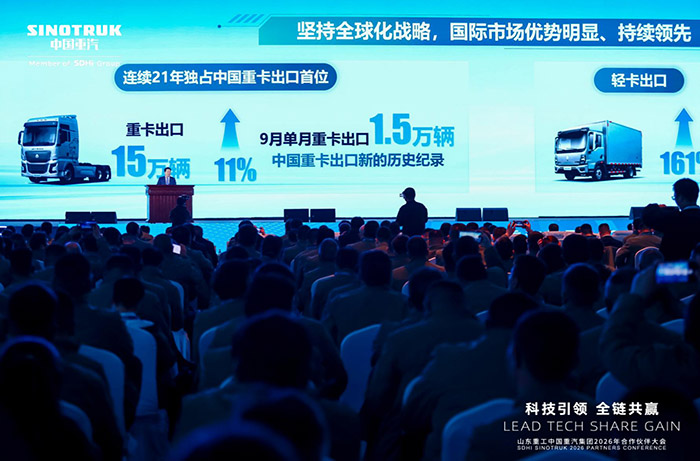 然而,突破纪录不易,超越自我更难。中国重汽在2026年开局之初的战略布局,清晰传递出“向更高目标冲刺”的坚定决心。面向2026年,中国重汽明确聚焦“产品、价值、生态、信任”四大关键词,为国际化发展再添新动能。在产品端,打造科技领先、性能卓越、质量可靠的产品矩阵,从研发、生产、供应链等多维度提升综合竞争力,精准匹配全球不同市场的差异化需求;在价值端,推动品牌持续向上、服务提效提质,落地“品牌即价值”“服务即价值”理念,让品牌认可与服务品质成为用户选择的核心理由;在生态端,聚焦新能源、二手车、金融、再制造等领域,构建可持续发展的产业生态,丰富合作伙伴的全价值链营销转型内涵;在合作端,升级厂商共赢理念,从团队建设、渠道赋能、市场开拓等维度加深信任,凝聚全球合作伙伴力量。