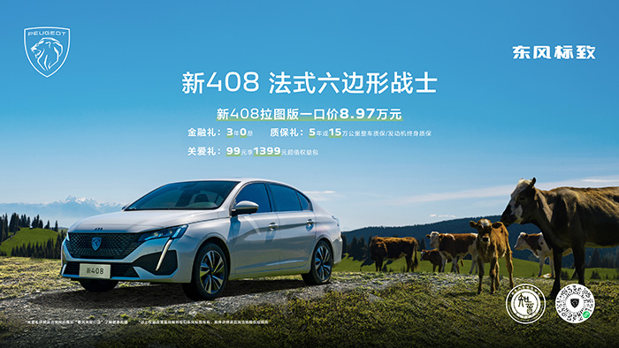 为让广大消费者尽享购车实惠,东风标致新408特别推出多重专属购车政策,涵盖多重礼遇与贴心方案:金融方面可享3 年 0 息优惠,轻松购车无压力;质保方面提供5 年或 15 万公里整车质保,更有发动机终身质保,用车安心无忧;同时可享99 元购价值 1399 元超值权益包关爱好礼,全方位守护用户的出行生活。多重福利加持,更有新 408 拉图版惊喜来袭,一口价仅 8.97 万元。