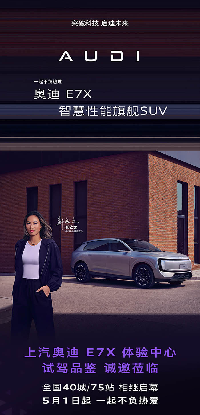 4月29日,上汽奥迪上海官宣,奥迪 E7X 线下体验中心将于5月1日起在全国范围内相继启幕,覆盖40座城市、75个站点,布局上海、北京、广州、深圳、杭州、南京、成都等全国核心城市的主流商圈。消费者可就近前往,零距离感受奥迪 E7X 实车,深度体验这款智慧性能旗舰SUV的魅力。目前,展车及试驾车已到上汽奥迪全国门店,欢迎进店品鉴。