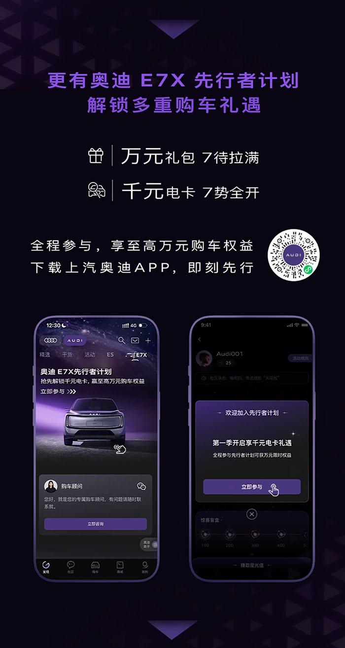 活动期间,用户可同步参与奥迪 E7X “先行者计划”,赢取千元电卡、万元权益等好礼。只需下载并登录上汽奥迪APP即可参与活动。通过完成指定互动任务累积对应积分,解锁多重专属权益。其中,首次添加企业微信助手,或累计获得200积分的用户,即可100%锁定1,000 元充电卡资格,电卡将在用户完成奥迪 E7X 购车及车辆绑定后正式激活,真正实现 “参与即享,购车兑现”;全程参与活动的用户,更有机会解锁至高万元购车礼遇。