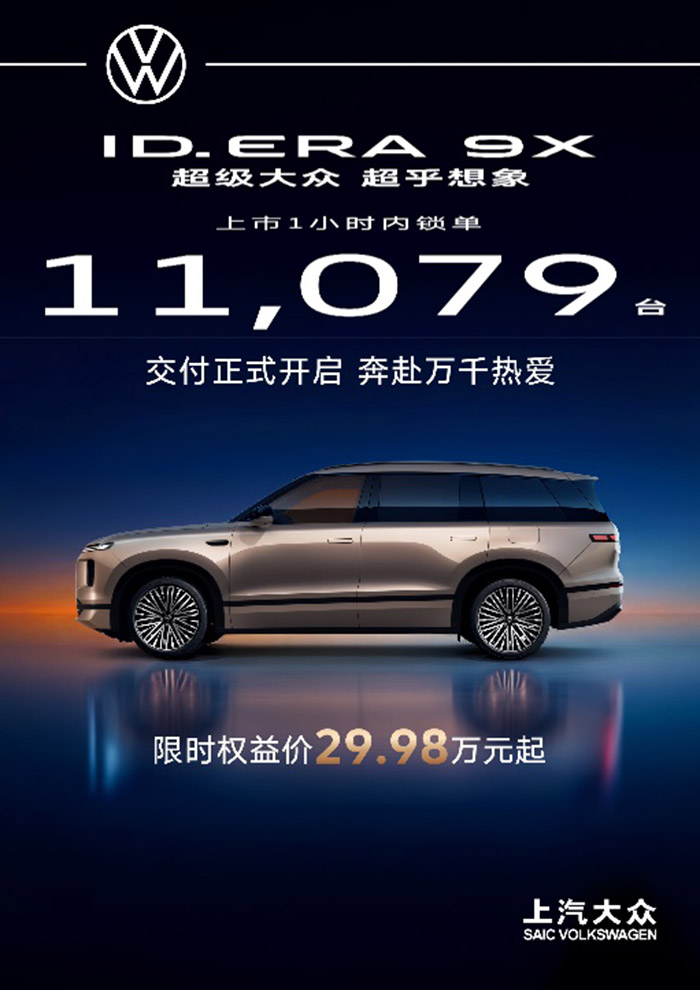 在4月25日北京车展上,ID. ERA 9X正式上市,凭借29.98万元起(*4月25日-5月31日,详情请洽当地经销商)的限时权益价瞬间引爆市场,上市仅1小时内,锁单量便达到11,079台。